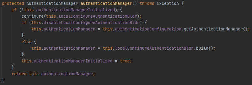 authenticationManager메소드는 WebSecurityConfigurerAdapter에 구현되어있는 메소드로 AuthenticationManager객체를 반환해준다.