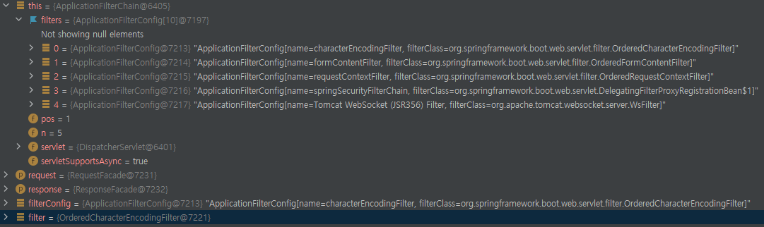 internalDoFilter는 ApplicationFilterChain이 갖고 있는 필터목록을 순회하며, filter를 하나씩 꺼내어 doFilter메서드를 실행한다.