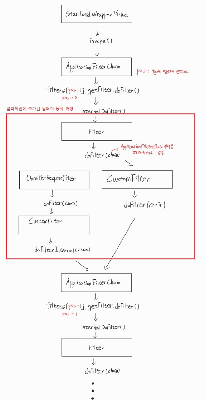 - Filter인터페이스의 doFilter를 구현한 필터클래스를 상속하여 doFilterInternal을 구현한 필터