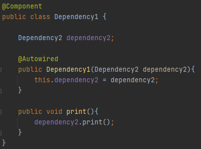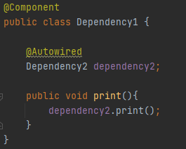 필드주입으로 Dependency1이 Dependency2를 사용하고, Dependency2가 Dependency1을 사용하는 상황이다