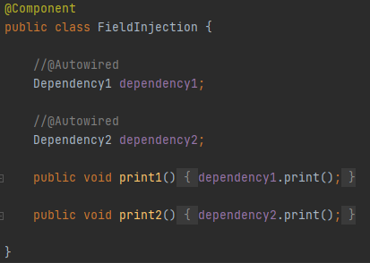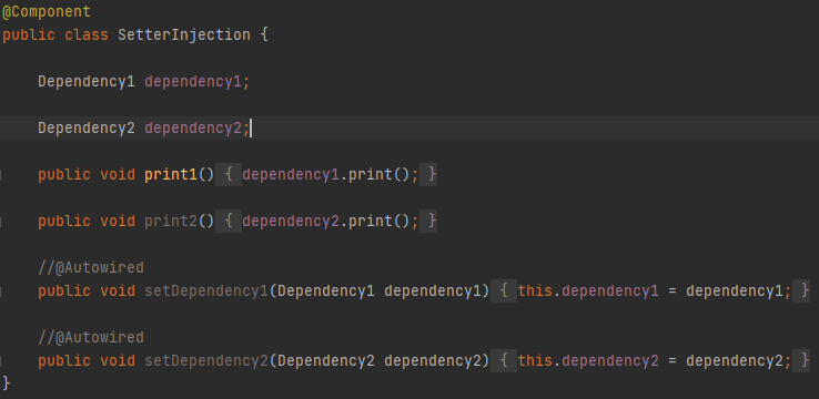 필드주입과 setter주입이 제대로 되지 않았다는 가정하에 autowired를 제거하였다.