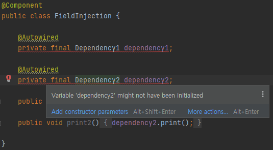 하지만 생성자 주입의 경우 컴파일 타임에서 바로 확인이 가능하다.