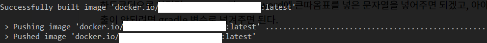 따라서 imageName에는 gradle 명령줄 변수로 입력받는 docker_id와 settings.gradle의 rootProjectname에 해당하는 proejct.name을 도커 허브 repository네임과 일치시켜 주어야 정상적으로 push가 된다.