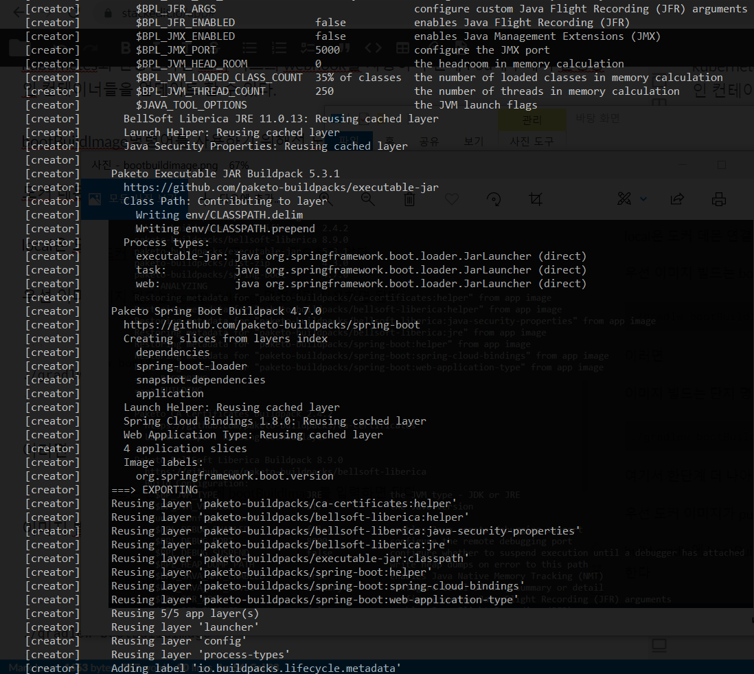 bootBuildImage 명령어는 애플리케이션에 맞는 설정을 바탕으로 레이어별로 나누어 이미지를 생성하게 되고, 수정된 부분만 다시 빌드하게 된다.