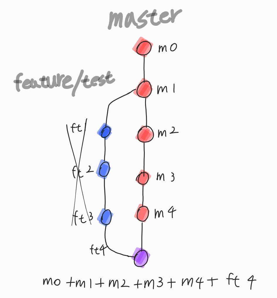 기존 feature/test의 커밋내역은 무시되고 새로운 커밋 하나만 더해져 총 커밋 내역은 m0, m1, m2, m3, ft4 와 같이 생성된다.