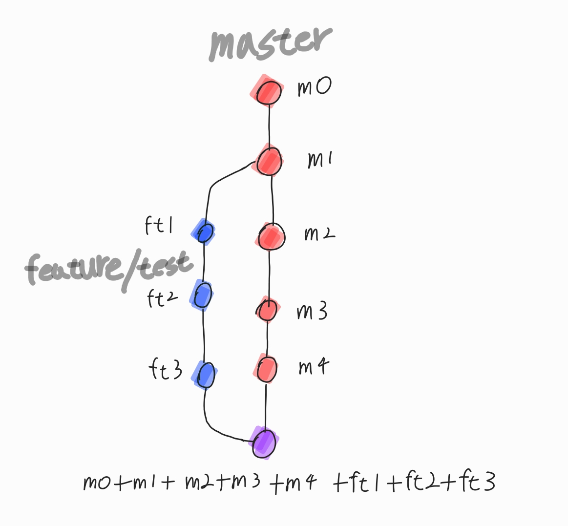 master브랜치의 커밋내역에 feature/test의 커밋내역이 더해져 총 커밋 내역은 m0, m1, m2, m3, ft1, ft2, ft3 와 같이 생성된다.