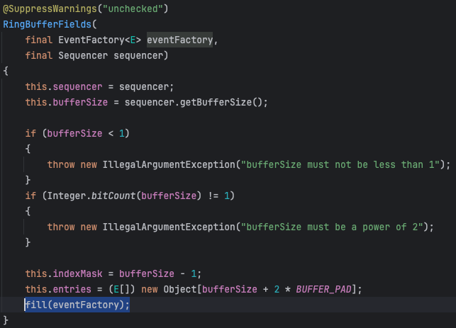 Disruptor의 크기만큼 할당받은 클래스를 인스턴스화하여 채워두는걸 볼 수 있다.