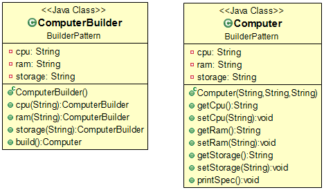 2. Computer객체 생성을 도와주는 ComputerBuilder클래스를 만든다. 이 클래스 역시 cpu, ram, storage를 멤버 변수로 갖는다. cpu, ram, storage 메소드를 통해 값을 저장하고 builder메소드로 Computer객체를 생성한다