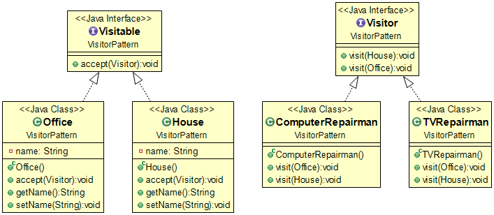 4. Visitor인터페이스를 구현하는 ComputerRepairman과 TVRepairman클래스를 생성하고 House와 Office타입을 받아 수리행위를 출력하는 visit메서드를 구현한다