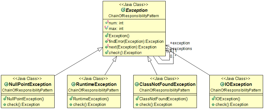 2. NullPointException, RuntimeException, ClassNotFoundException, IOException클래스는 Excetpion추상클래스의 check메소드를 오버라이딩하여 현재 클래스의 이름과 일치하면 현재 클래스를 반환하고 일치하지 않으면 next메소드를 호출하여 인자로 받아온 Exception인스턴스를 다음 Exception클래스에 넘겨준다